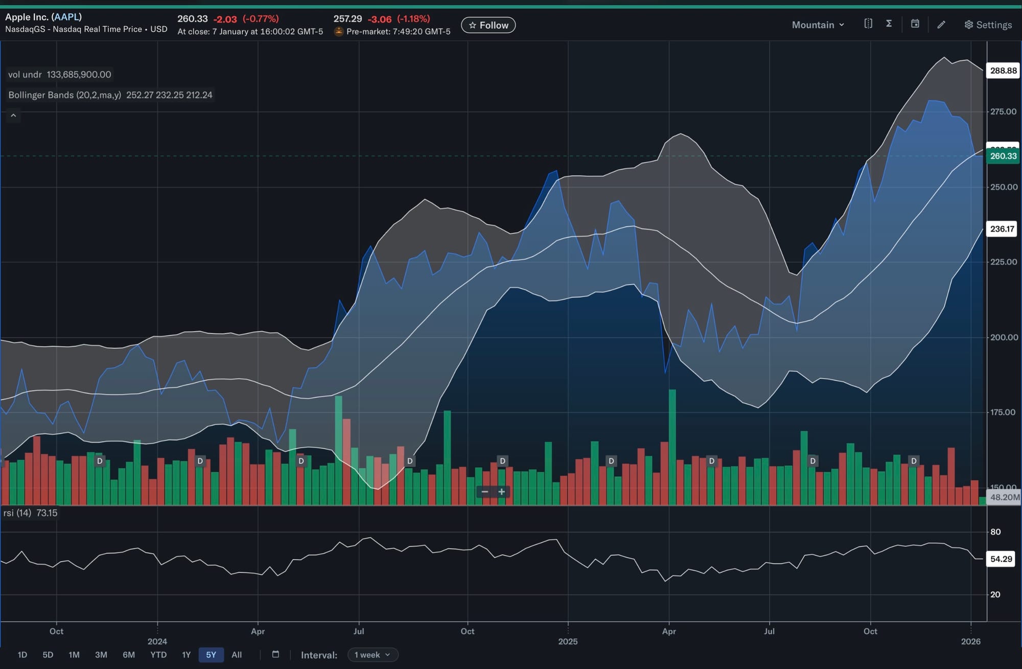 Apple enters 2026 priced on promises. There’s no progress. AI is still “next year,” AVP is already a value write-down, and the stock has barely beaten inflation in twelve months. Strip out the hopium and the 5-year chart tells a quieter, more uncomfortable story near term. Today: $256 @ the open.
