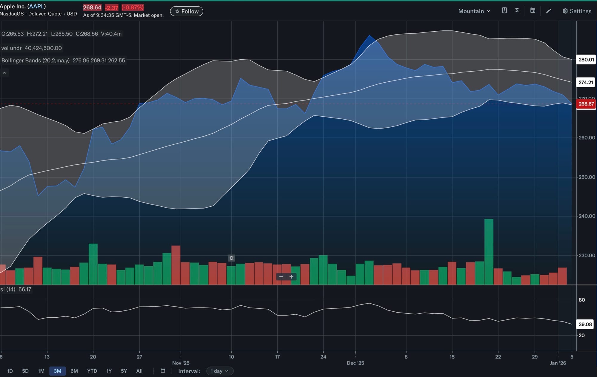 Apple’s post-Venezuela wobble isn’t about Caracas, more about gravity. AAPL has overshot on Ives’ hopium, AVP is already priced as a write-off. The only level that matters near-term is $268. Above it: noisy optimism. Below it: stops, slides, and a reminder this is a value story, not a growth myth.
